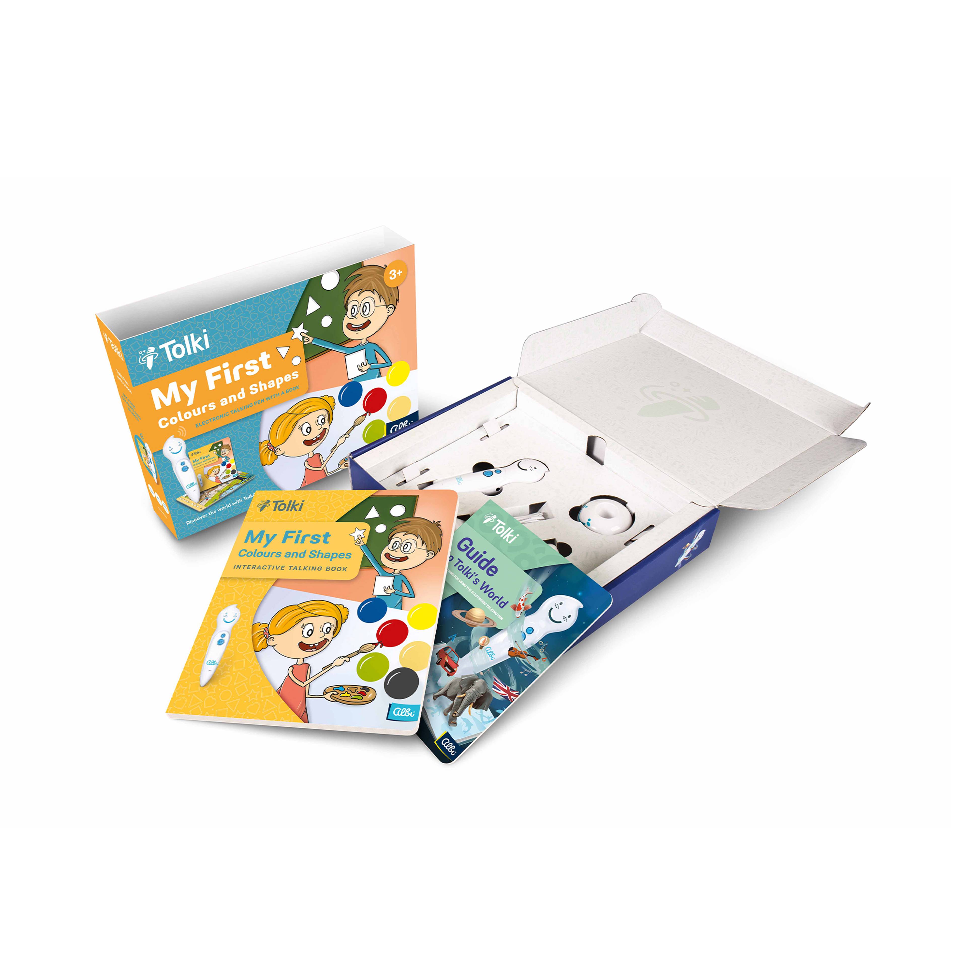 The set includes: Tolki the Electronic Talking Pen 1.0, My first colours and shapes book, 32 GB SD card, charger, USB cable, Guide to the Tolki World, headphone jack (headphones are not included).